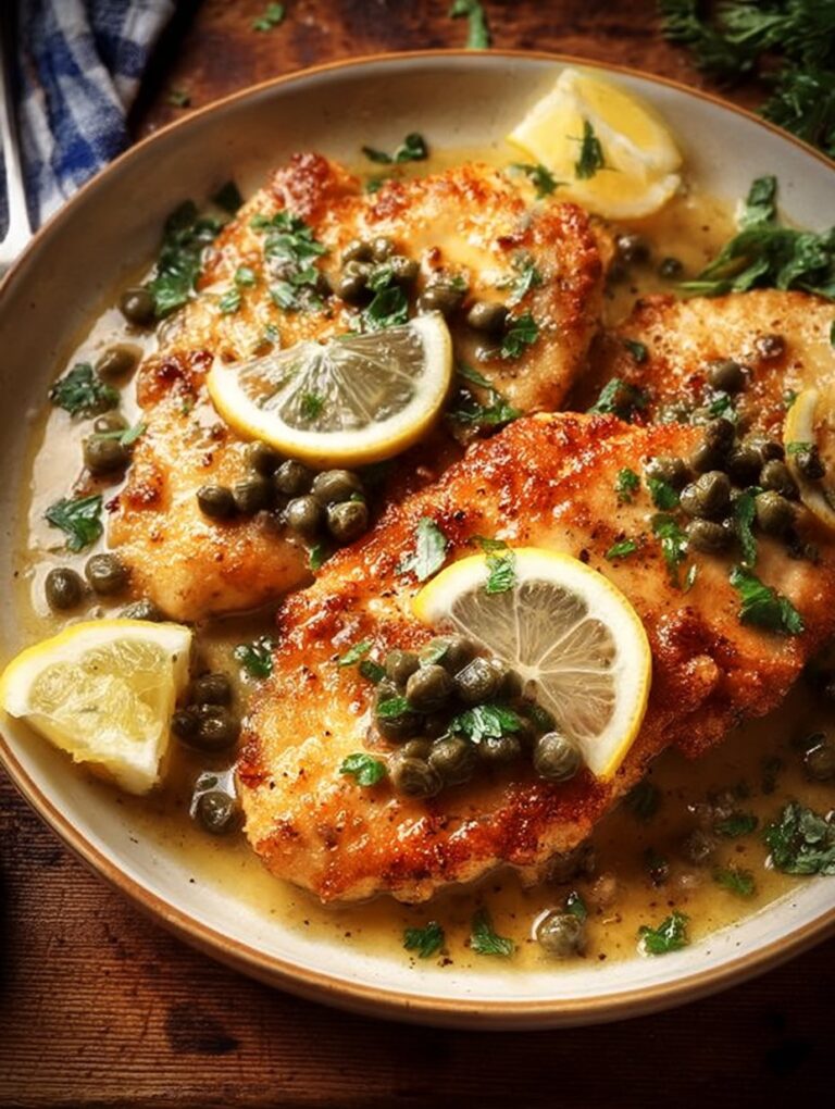 - In the same skillet, add chicken broth, lemon juice, and capers; bring to a simmer.
